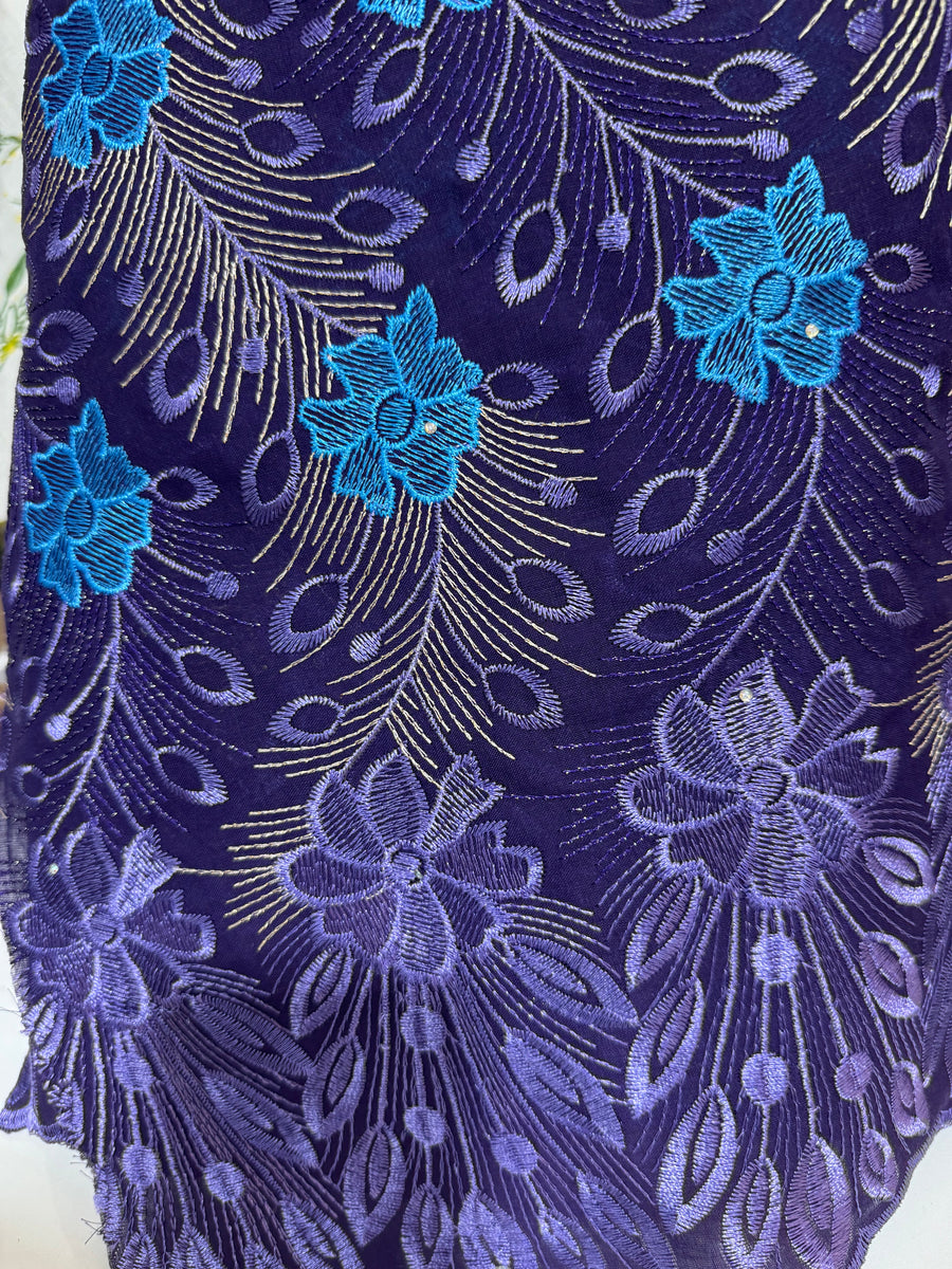 This beautiful African lace features delicate embroidered flowers adorned with sparkling rhinestones in rich purple and blue hues. Ideal for adding a luxurious and eye-catching touch to your fashion or special event designs.