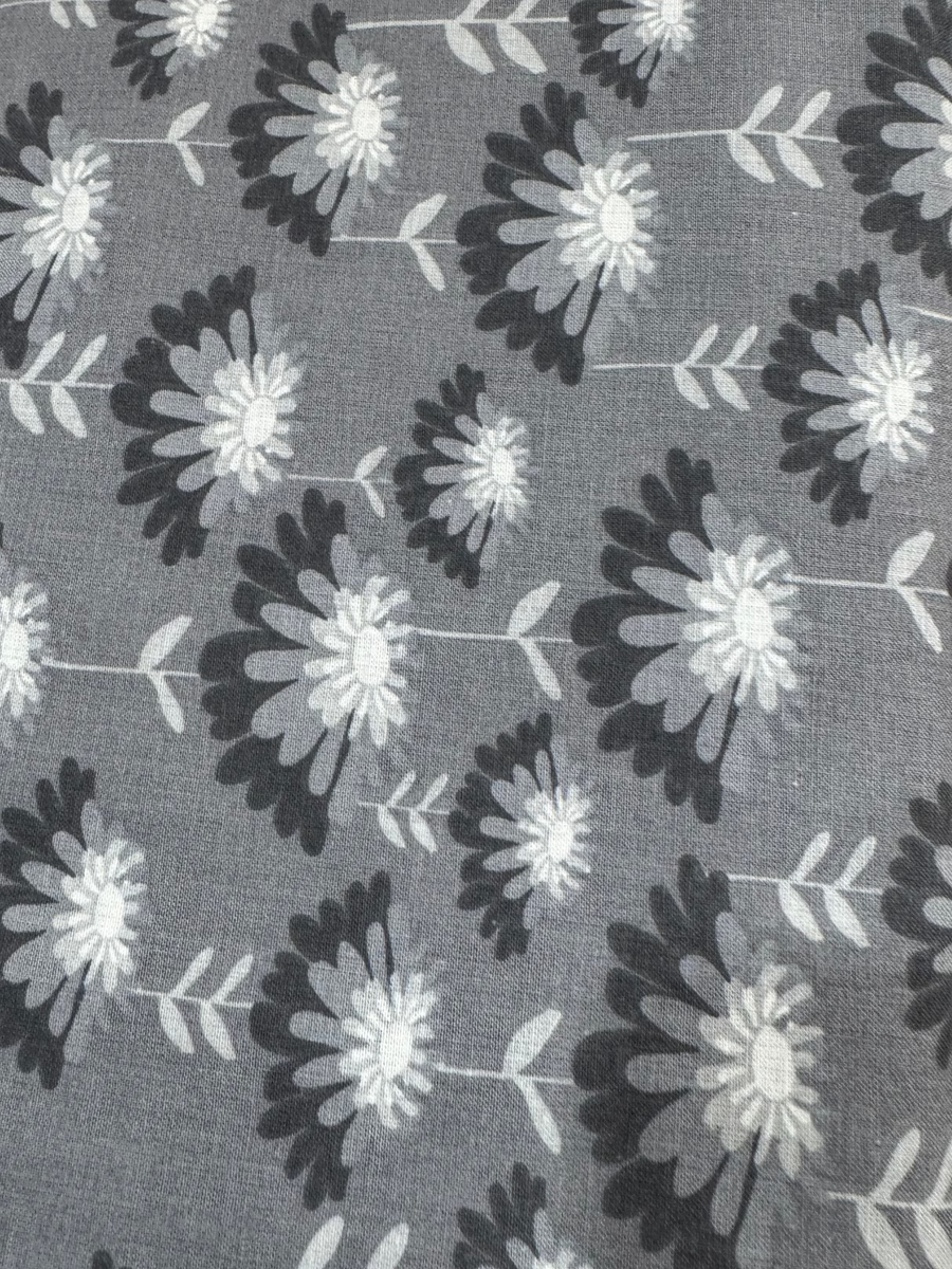 This charming quilting cotton fabric features a soft gray background adorned with delicate daisy flowers, adding a subtle yet fresh touch to your projects. Perfect for creating both elegant and modern designs.