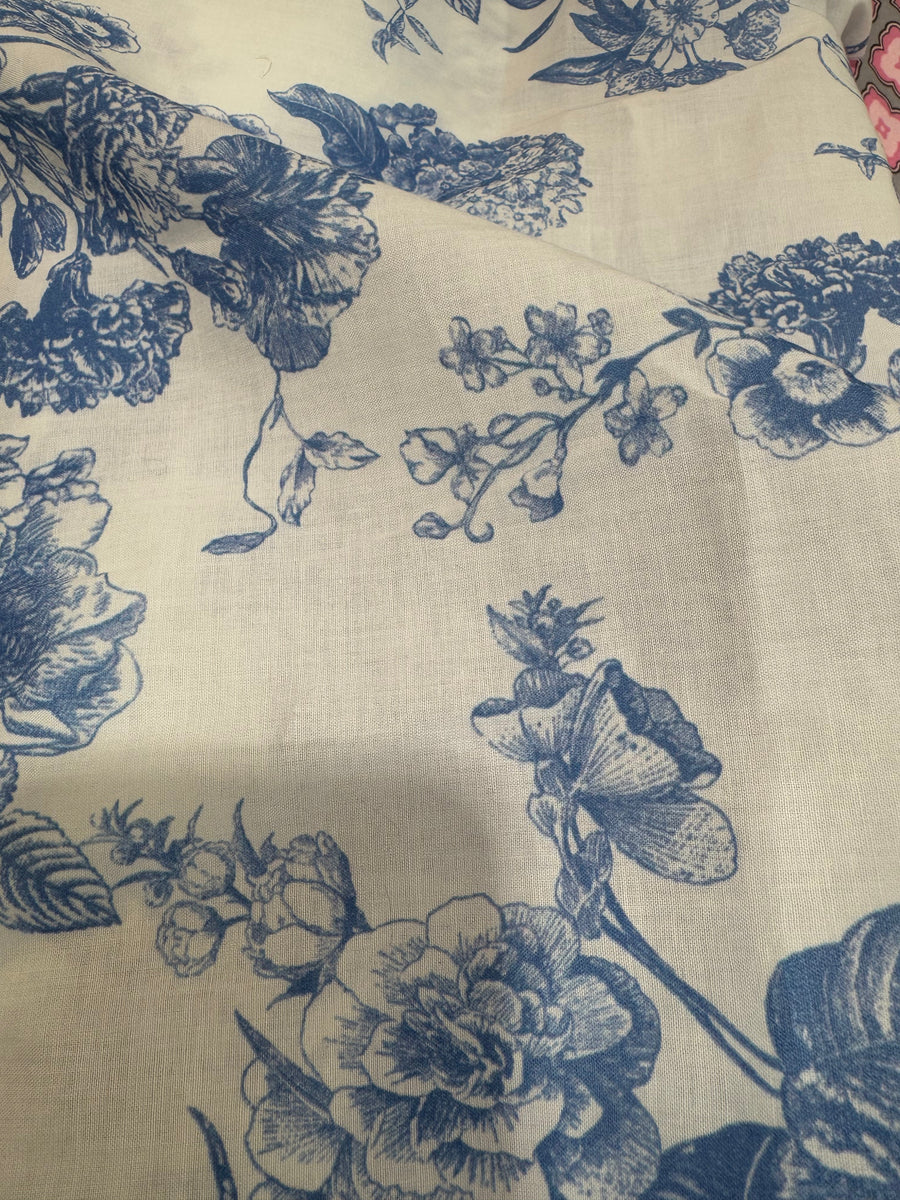This elegant cotton lawn fabric features a crisp white background with delicate blue flowers. Its lightweight, breathable texture makes it ideal for creating soft, flowy garments with a refined look.